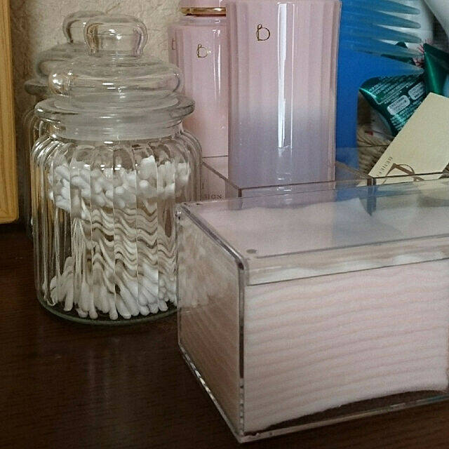 miyumiyuさんはアクリルケースにコットンを収納されています。中が見えるケースを使うことでコットンの減りも分かりやすく、蓋つきなので衛生的に収納することができますよ。コットンはお肌に使うものだからこそ、衛生面はとても重要ですよね。アクリルケースを使った収納は、とても参考になります。