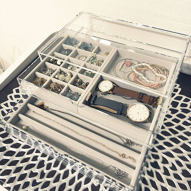 アクセサリーの収納に無印良品の引き出し式アクリルケースを使っているyuuraさん。アクリルケース用の内箱仕切りを使うことで、指輪や時計などをジャンルごとにスッキリ収納することができます。