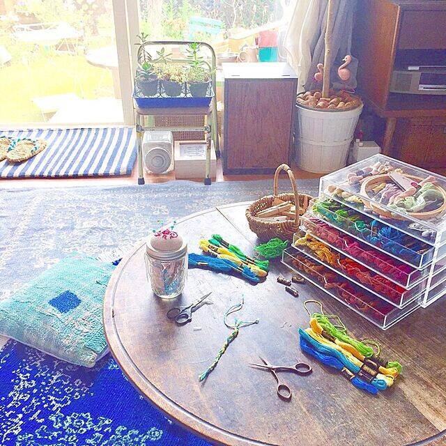 snowbellさんは刺繍糸の収納にアクリルケースを活用しています。アクリルケースのクリア感を活かし、色分けして刺繍糸を収納することで、どこに何が入っているのか一目で分かるところがとても便利なのだとか。ビーズなど、他のハンドメイド材料の収納にも応用することができそうな収納アイデアです。