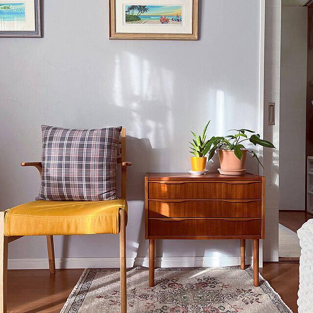 siosai10さんは、無印良品のチェック柄のクッションカバーを使っています。黄色い座面のイスを引き立ててくれる、アクセントになっていますね。ヴィンテージチェストのある上質なインテリアに、温かみがプラスしてされています。