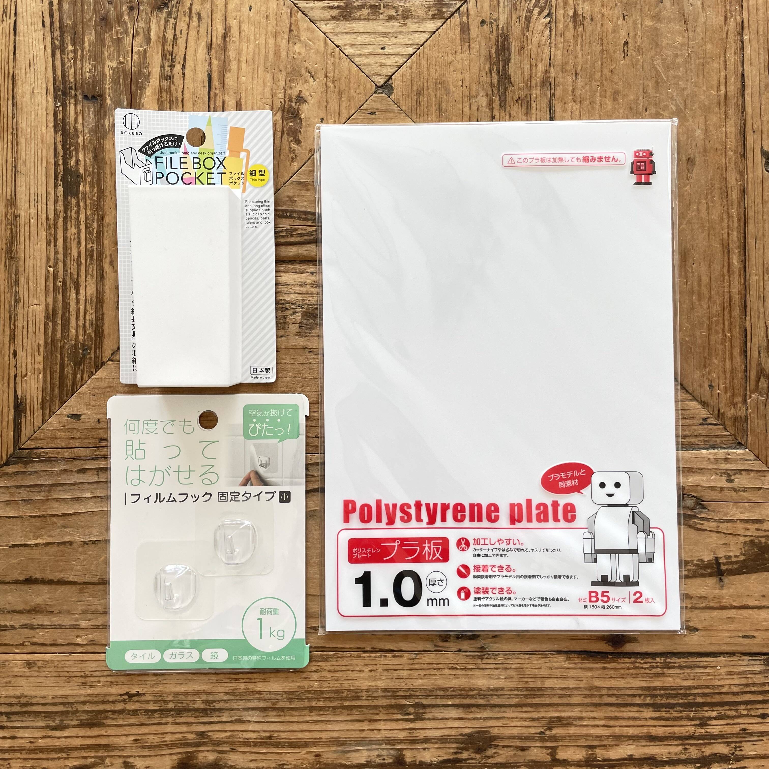 プラ板(縮まない厚めのタイプ)【Seria(セリア) 売場:DIY材(スノコ、工具、フック等)】ファイルボックスポケット【Seria(セリア) 売場:オフィス/文具】フィルムフック【Seria(セリア) 売場:オフィス/文具】■必要な道具