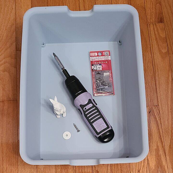 収納ケース【Can Do(キャンドゥ) 売場:収納】うさぎ石膏オブジェ【Seria(セリア) 売場:装飾品】ネジ【その他 売場:DIY材(スノコ、工具、フック等)】ドライバー【その他 売場:DIY材(スノコ、工具、フック等)】■必要な道具