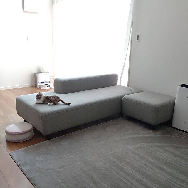 グレーカラーでコーディネートされた、hiroriyuさん宅のリビングの実例です。すっきりと開放感に溢れているのは、背もたれの低い、無印良品のソファベンチのおかげ。座面の位置も低いので、ラグとの一体感もあります。
