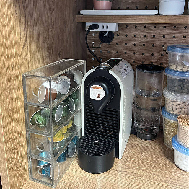 無印良品のアクリルメガネ・小物ケースで、コーヒーカプセルを整理整頓されているmimikurysさんの実例です。こちらのケースは食器棚に両面テープで固定しているとのことで、掃除もしやすくしているのだそう。透明タイプのケースは残量も分かりやすいのが、良いですね。