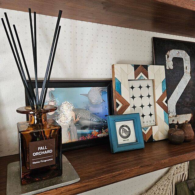 ニトリのアロマディフューザーを棚に飾っている.AQUA.さん。茶色の瓶や黒のスティックが周囲の色合いとマッチし、フォトフレームコーナーにも自然と溶け込んでいます。香りは、紅葉の並木道をイメージした「フォールオーチャード」。たまにスティックの上下を入れ替えることで、香りが増して、より楽しめるそうです。
