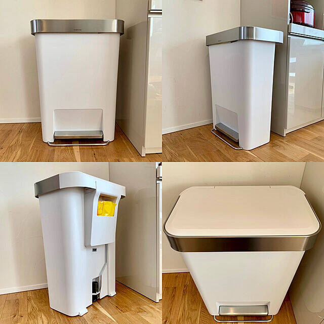 豊富なラインナップがそろう、simplehumanのダストボックス。まずはペダルを踏んで蓋を開閉する、ステップダストボックスをご紹介します。45Lの長方形タイプと、蓋が左右に開くバタフライタイプがあります。軽く踏むだけで蓋が開き、閉まるときはゆっくりと、快適な使い心地です。