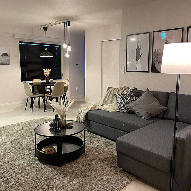 アイアン素材のアイテムが大好きという、manchanさん。モダンでクールな雰囲気のリビングとなっています。ラグは、IKEAの「ヴィンドゥム」を使用されています。パイルが長めの厚手で、違う色の糸が組み合わさっているのもポイントです。