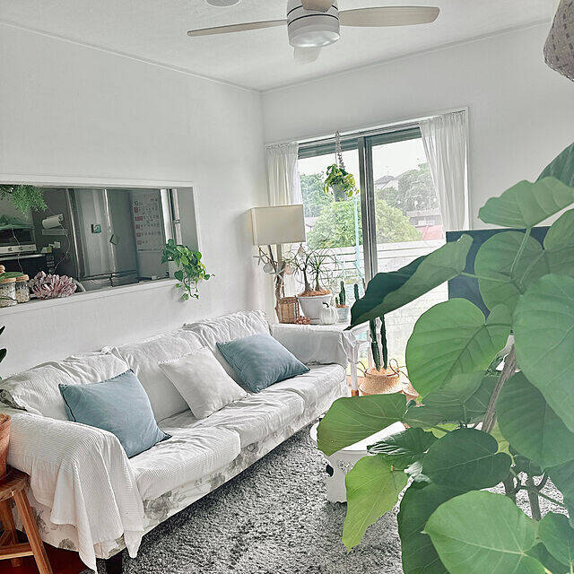 海外のリゾートのような、爽やかなコーディネートが印象的なMegumiさんのリビング。ソファの上にある水色のクッションカバーは、IKEAの「グルリ」です。綿100%でシンプルなデザインに好感が持てます。好きな色を差し色にするのもいいですね!