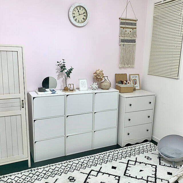 こちらのユーザーさんは、ホワイトの扉付きカラーボックスを3つ並べて使っていました。同じ高さでそろえて、上部をディスプレイスペースにしています。扉付きで中が見えないので、スッキリとした印象ですね。白で統一された家具が、背後の桜色の壁に映えています。