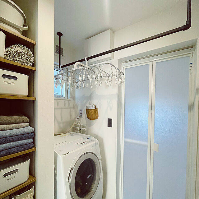 洗濯機上のスペースに突っ張り棒を渡して、収納として有効活用されているMaroさんです。ハンガー以外に、ハンキングバスケットを吊るして洗濯ネット収納にされていました。バスケットは2段あるので収納力も高そう。ポイッと入れるだけでもサマになります。