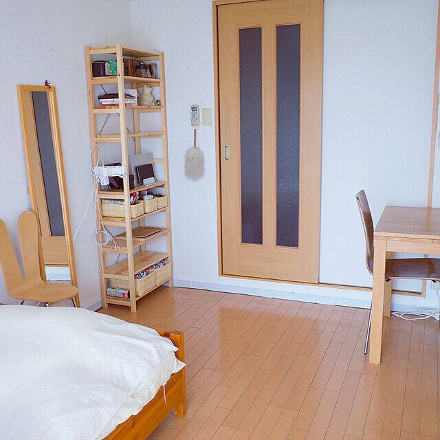 1Kのお部屋に住んでいるユーザーさんの実例です。木のぬくもりが全体的に感じられる空間で、無印良品のパイン材ユニットシェルフもよく馴染んでいますね。空いている段もあるので、抜け感のあるすっきりした開放的な収納になっています。