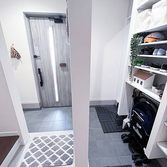 Yuki-.-happyさんは、ウォークスルーの家族用玄関に可動式の棚を設置して、靴や小物をきれいに収納しています。なお、向かって左側の壁はマグネットウォールになっているそう。小物入れやフックを好きな場所にペタッと貼り付けることができるので、使い勝手がグンとアップしますね♪