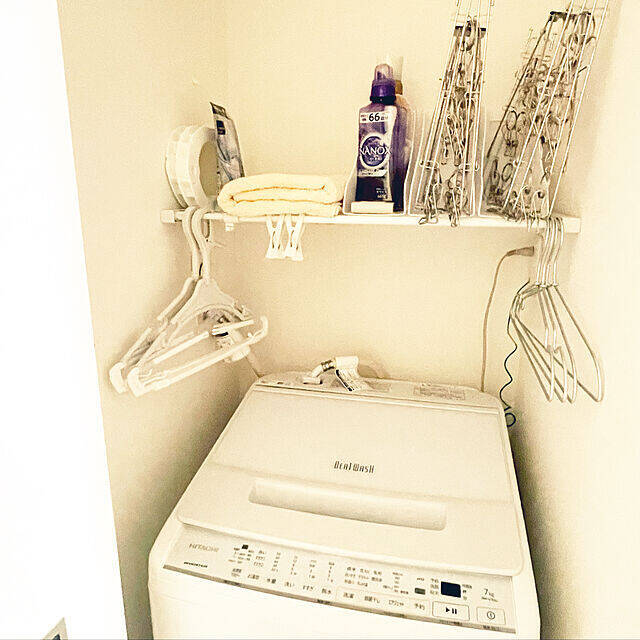 無印良品の洗濯ハンガーを壁に掛けて収納されている、naoさん。シンプルなデザインの洗濯ハンガーは、出しっぱなしでも雑然として見えませんね。必要なときにもさっと取り出せて、洗濯物を干すのもスムーズにできそうです。