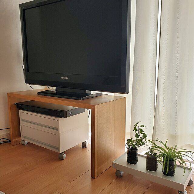 asamaoさんは、無印良品のコの字の家具をテレビ台として利用されています。シンプルなデザインの家具は、どんな用途にも使いやすいのが良いですね。縦置きの場合の耐荷重は40kgと、しっかりした作りも頼もしいです。