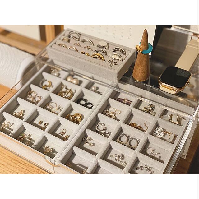 sevenさんは、無印良品のアクリルケースでピアスや腕時計を収納されています。実例のようにケースの上も収納スペースとして使えば、使い勝手も良くなりますよね。コンパクトながらたくさんのアクセサリーが収納できるので、片付けやすそうです。
