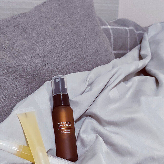 無印良品のフレグランスミストを愛用されている、ykさんの実例です。ユーザーさんはこちらの「おやすみブレンド」を、眠る前の香りづけに活用されているとのこと。何かと慌ただしい毎日にも癒しがもらえそうなアイデアですね。