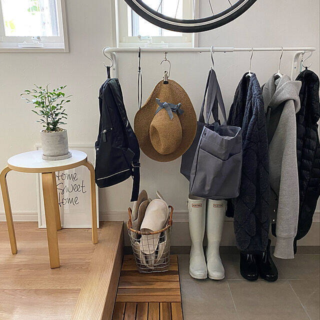tomimiさん宅の玄関で見つけたのは、IKEAのハンガーレール、MULIGでした。このアイテムを取り入れることで、壁面が収納場所として活用できるようになるんです。出かける際にサッと手に取りたいアイテムの収納にぴったりですね!
