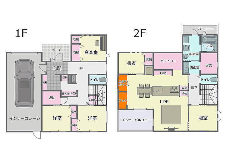 eightさん宅は、2階建て5LDKの間取りです。インナーガレージ、インナーバルコニー、2階リビングと、間取り図をパッと拝見しただけでも、特徴的であることが分かります。こうした『家のカタチ』もeightさんの収納づくりの重要な要素となっているのだそう。そこでまずは、間取りの段階から計算されたこだわりの動線設計について教えていただきました。