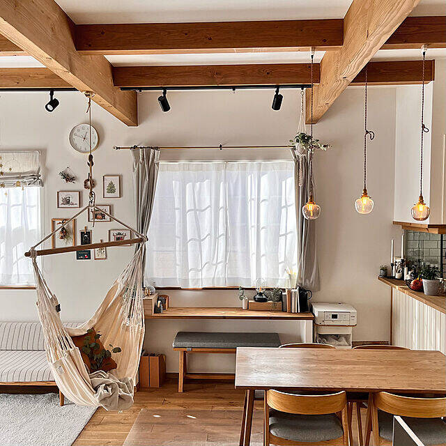 ハンモックチェアのコンフォートサイズがあるのは、higenekoさんのリビングダイニングです。ご家族で読書やテレビを見るときなど、心地よい揺れにリラックスしながら癒しの時間を過ごされているそうですよ。ハンモックの生地は、洗濯可能なところも魅力的です。ご家族の生活になじむハンモックですね。