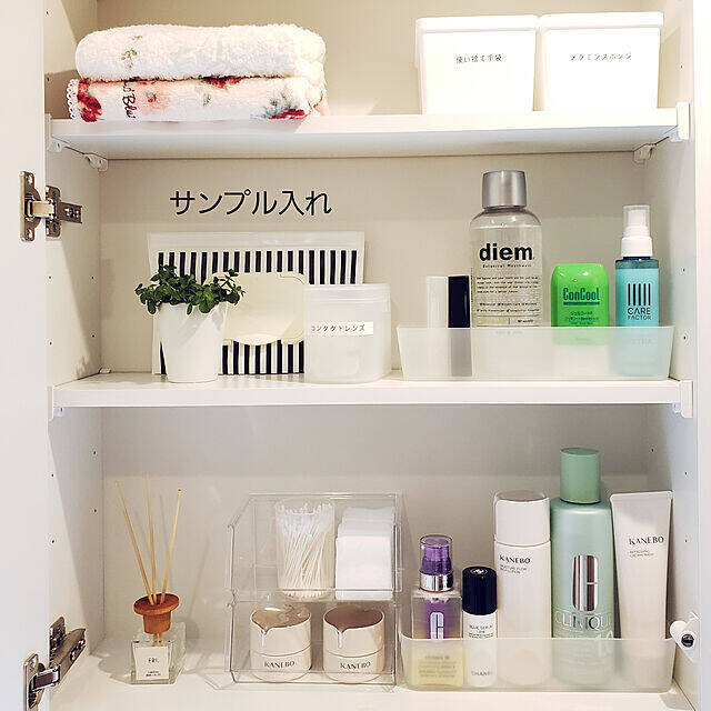 azu_homeさんは、洗面台の鏡裏のスペースに、スキンケア類を収納していました。ケースの中に、使う順番に右から並べて入れているそうです。扉を開いたまま左手で手に取り、右側にある鏡を見ながらお手入れするという、動線も抜群なんだとか。扉を閉めれば隠せるので、ミニマルな収納をしたい方におすすめです。