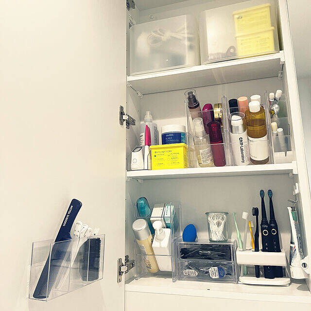 100均やホームセンターで手軽に購入できるアクリルケースは、サイズ展開が豊富で好みのものを見つけやすい点が魅力です。myurin.comさんは、仕切りのついたスリムタイプのアクリルケースを、扉裏に両面テープで取り付けされています。小物類を種類ごとに分けて整理できるのが便利ですね。