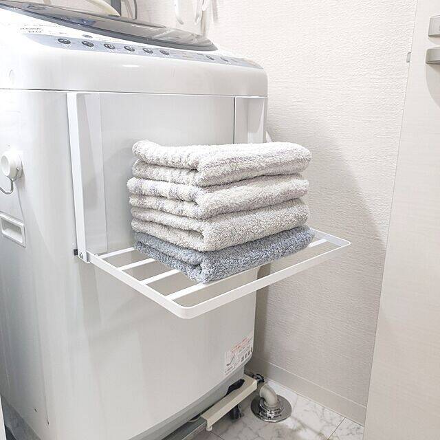 Jijiさんは、山崎実業のtower「洗濯機横マグネット折り畳み棚」を愛用されています。バスタオルやパジャマを置いたり、バスマットを干したり、ハンガーを引っ掛けたり、使い勝手がいいそうですよ。使わないときは、コンパクトに折り畳めるのもポイントです。