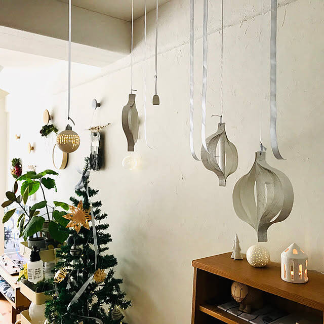 ご自宅で余った壁紙を使い、モビールを作ったHisayoさん。ショップにあるオーナメントを参考に作られたそうですよ。壁紙の曲線がアートなデザインを作り出していますね。ご自宅にあるものを活用したステキなDIYです。