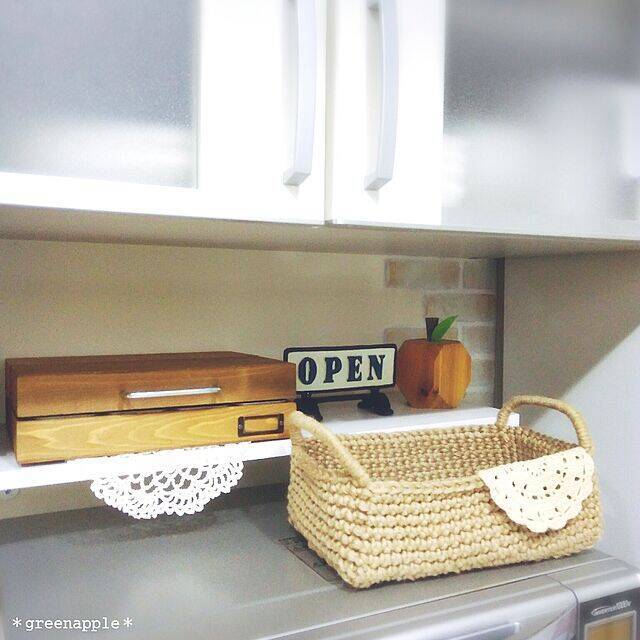 麻紐を使ってカゴを編んでいる、greenappleさんの実例です。こちらは、キッチンでちょい置き用に使っているのだそう。ナチュラルな雰囲気の麻紐に、さりげないドイリーのアクセントが魅力的ですね。