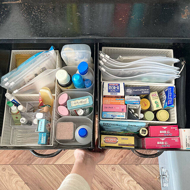 mako2yaaさん宅でも、薬収納にEVAケースが活躍しています。ケースがソフトながらも自立することがお気に入りなのだそう。引き出しごとに薬を「塗る系」「飲む系」で分け、ばんそこうやテープといった救急雑貨、病院で処方された薬などを収納しています。立てる収納でスペースを節約できるのもうれしいですね。