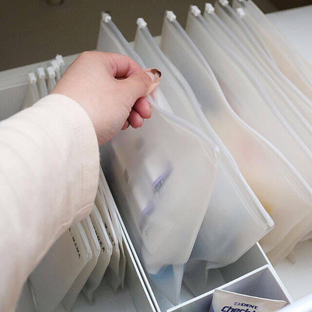 411.kaoriiiiさんは、EVAケースを使って洗面台下を整理しています。中に入れているのは、薬や細かなストック類。ラベルを貼って一目でわかるように工夫していますが、透けて見えるのでわかりやすいそうです。洗面台下はゴチャつきやすいので、実例のようにEVAケースを上手に使いこなしたいですね。