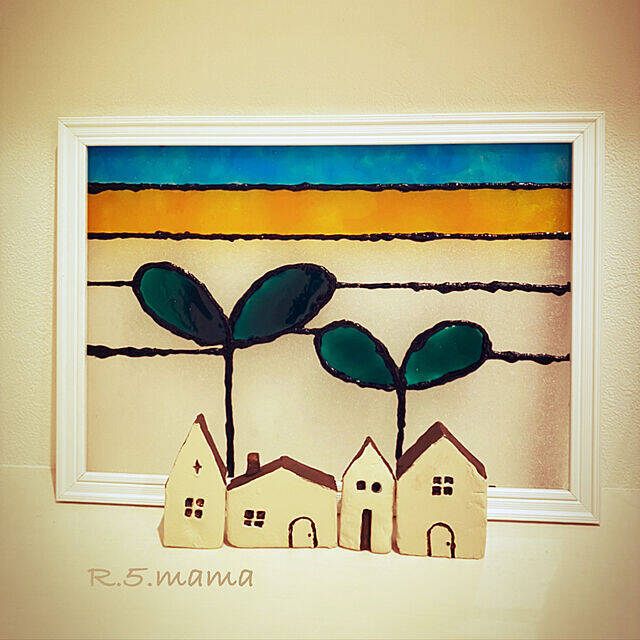 ダイソーのガラス絵具を使い、ステンドグラス風フレームをDIYしたのは、R.5.mamaさんです。黒色の枠と色使いが本物のステンドグラスのように見えますね。手作りのあたたかさが伝わる作品です。一緒に置かれているお家のオブジェも、かわいらしいですね。