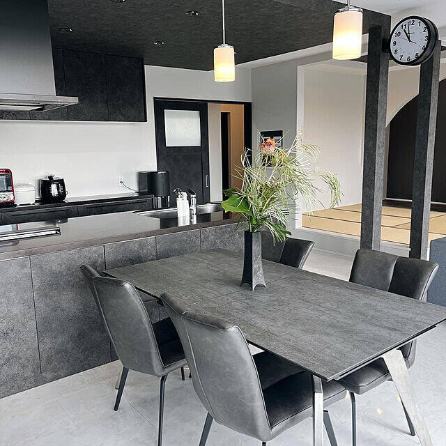 mattari_homeさん宅のダイニングキッチンは、モノトーンでまとめたモダンな空間。テーブル、チェア、キッチンは、どれもニュアンスのあるダークグレーを選ばれています。このように、使う色の数もできるだけ少なく抑えると、ホテルのような品格と落ち着きのあるインテリアが叶いますよ。