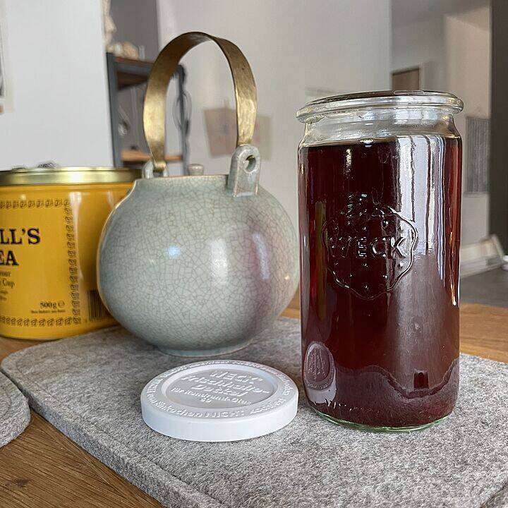 「ミルクティー用の紅茶の原液を保存するのに使っています。キャニスターにはもともとガラス製の蓋が付属しているのですが、目的に合わせて別売りのプラスティック製の蓋を購入したんです。真っ白な色もロゴも可愛くて、冷蔵庫の中でも出していても、おしゃれな佇まいでいてくれます。」