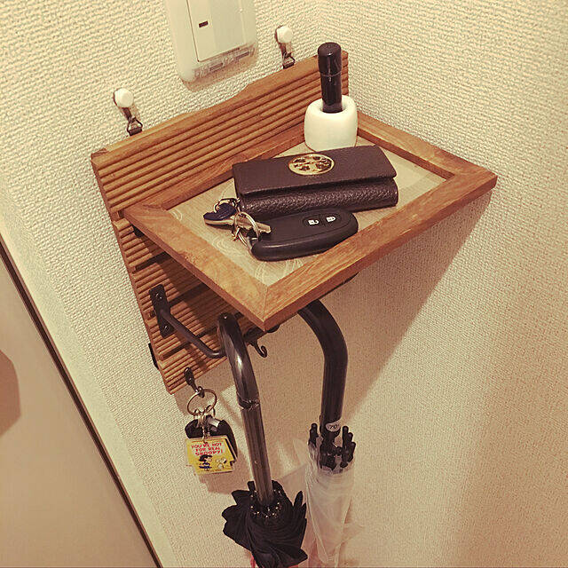 na.roomさんは玄関ドアの横に壁掛けの棚を作りました。セリアのウッドデッキパネルの溝に写真立てを垂直にさし込んで、鍵や印鑑が置けるようにしています。下に設置したアイアンバーが傘掛けにもなっていて、コンパクトながら機能的です。