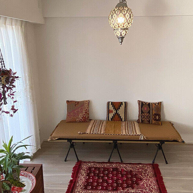 Kさんは、VENTLAXのキャンプベッドを、ベンチとして活用されています。実例のように、壁際に配置してクッションを置くことで、よりインテリア感が増しますね。