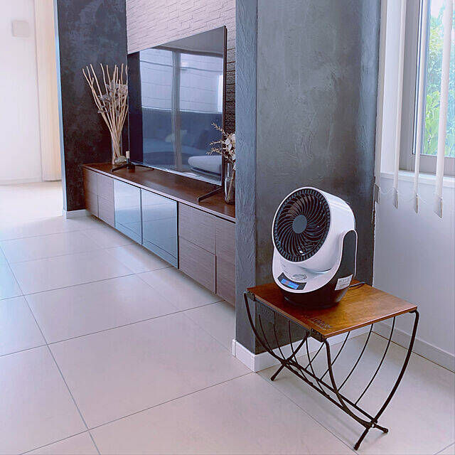 ntayさんは、LOGOSの薪ラックにサーキュレーターを置いて活用されています。曲線を描く脚のデザインがユニークで、スタイリッシュなインテリアとしても目を引きますね。通常は薪を置いて使用するアイアンのラック部分に、ブランケットや雑誌などを入れても、おしゃれに収納できそうです。