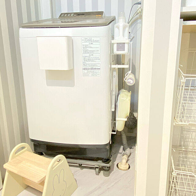 多くの洗濯機の側面はマグネットが貼りつくため、マグネット収納が手軽でおすすめ。shilohyさんは、towerの洗濯機横マグネット収納ラックを使っています。洗剤のほかに、バスブーツやコロコロクリーナーなどを収納。専用ラックは実用的なうえ、見た目も美しく整います。