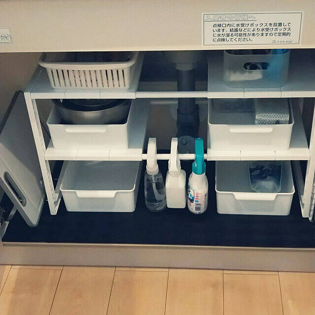 こちらは、無印良品のファイルボックスがぴったりと収まった、kajiさん宅のシンク下収納です。ファイルボックスには、洗剤のストックやレシピ本などを分けてしまっているそう。生活感の少ない、美しい収納が叶いますね。また、配管の手前には突っ張り棚を設置し、スペースを無駄なく活用しています。