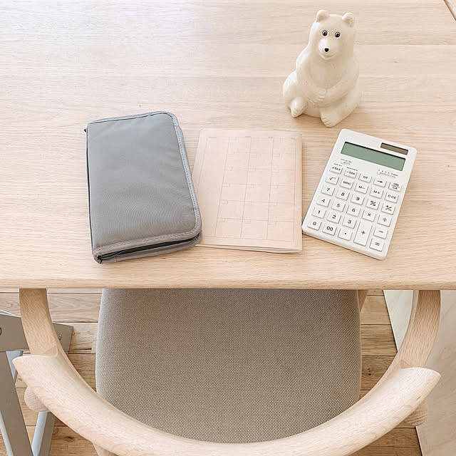 n_nさんが使用されているのは、無印良品の「電卓12桁」です。ABS素材を使用したシンプルなデザインが特徴です。ボタン電池と太陽電池のツインパワーで、高さを変えられるスタンドも付いています。お気に入りのアイテムなら、作業もはかどりそうですね。