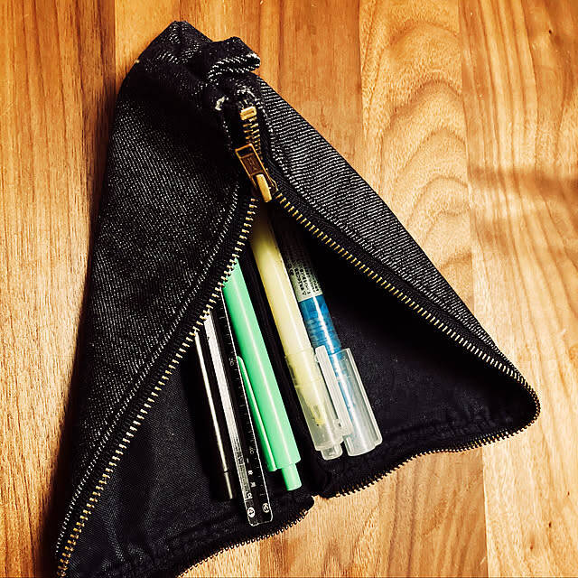 mrさんは、無印良品のペンケースを愛用されています。口がガバっと大きく開くタイプなので、とても使いやすいそうです。テーブルの上で全開にすると中身が見やすいですね。流行りに左右されない無地のデザインは、長く使えるはずです。