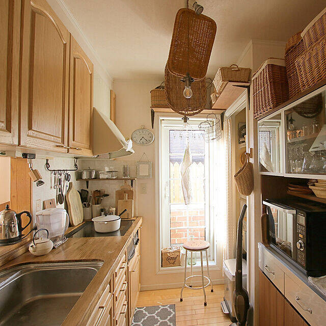 こちらの実例では、木のぬくもりあふれるキッチンをカントリー風に仕上げています。天板はタイルだったのを木材に貼り換えたそうで、全体の統一感がありますね。至るところでカゴが使われていて、カントリー風の自然の優しさを感じます。