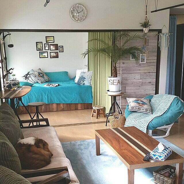観葉植物が大好きだという、こちらのユーザーさん。お部屋の四方に大きな植物を配置して、自然のフレッシュさがあふれるバリ風のリビングを作っています。ブルーのテーブルランナーがアクセントになっていていいですね。大きな植物に囲まれながら、リラックスした時間を過ごせそうです。