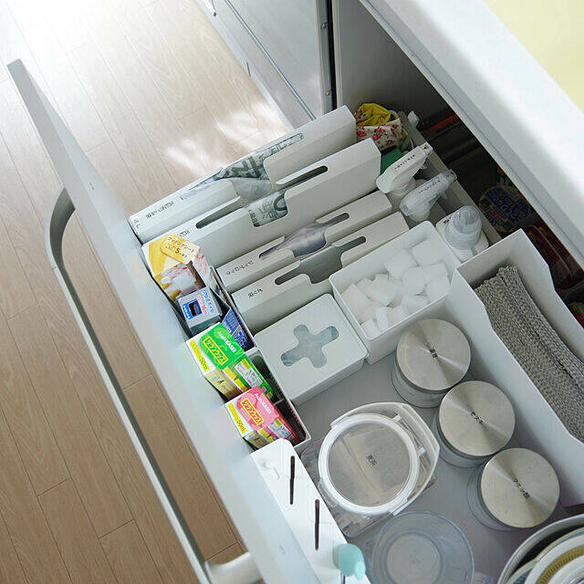 引き出しにラップを収納するとき、奥の方にいってしまうと取るのが大変です。Shooowkoさんはラップを立てて収納しています。これなら引き出しを開けたときに一目でわかりますね。収納ケースを使って、立てているそうですよ。深さのある引き出しにも収納しやすいですね。