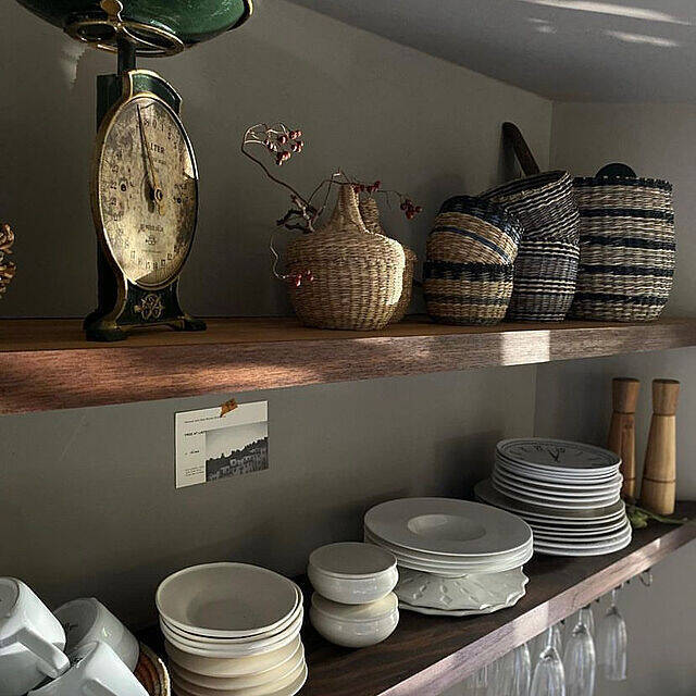 小ぶりのカゴを集めて飾られていた、mukuさんの実例です。こちらの実例では、白の食器との相性を考えてモノトーンテイストのカゴを選ばれていましたよ。細々したアイテムの収納に使いやすいのが、こうした小さなカゴ。コーディネートも考えてお気に入りを探したいですね。
