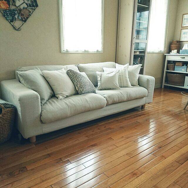 明るい色味のソファをリビングに使っているユーザーさんがこちら。木の質感が魅力的なテーブルやベンチにグリーンを合わせ、自然のさわやかさがあふれるボヘミアンな空間を作っていますね。淡い色味が空間によく馴染んでいて、明るく広々したリビングになっています。