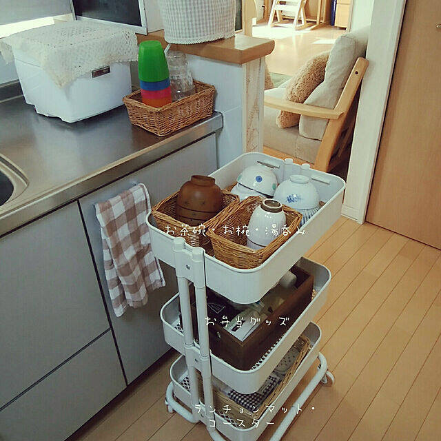 キッチンワゴンに、お茶碗類やお弁当グッズを収納している、naoさんです。毎日使うお茶碗が、すぐ手に届く位置にあり使いやすそうですね。かごを使って食器をわける工夫もされています。2段目と3段目には、お弁当グッズやランチョンマットなどが収納されており、こちらも使いやすそうですね。