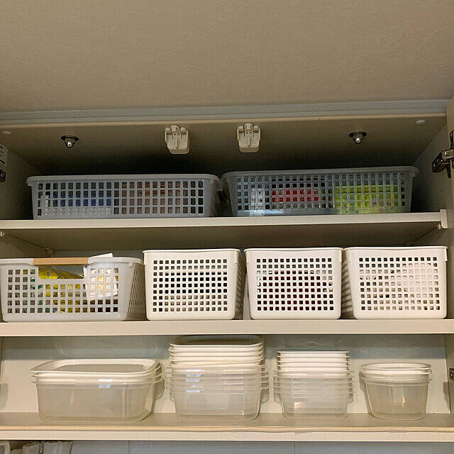 miyabiさんは、タッパーの種類を統一して棚に収納しています。スタッキング可能なタッパーなら省スペースなうえ、蓋を別に収納しても組み合わせに手間取ることがありません。実例のようにホワイトのタッパーなら見た目もすっきりキレイ。サイズ別に並べてとても使いやすそうです。