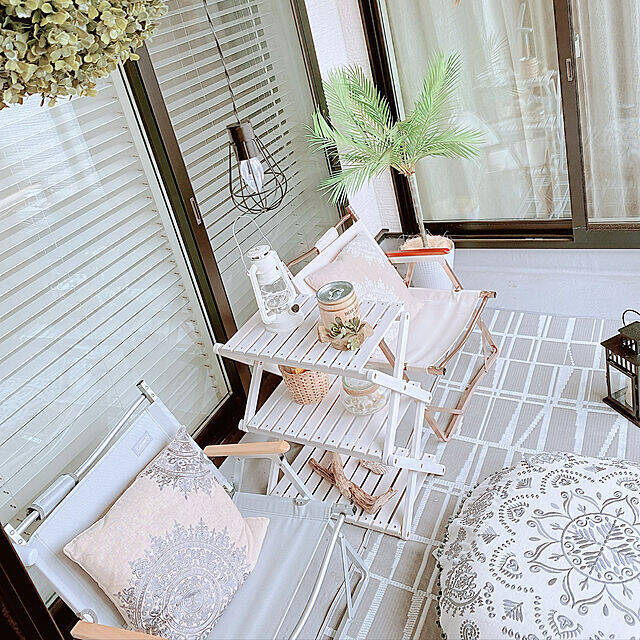 こちらはbonitaさんのインナーバルコニーです。白とグレーでコーディネートされた空間は、まるでリゾートようです。並べられたコールマンの「コンパクトフォールディングチェア」と木製ラックが、ナチュラルで心地よい雰囲気を演出していますよね。外の風を感じながら、ずっと座っていたくなるようなスペースです。