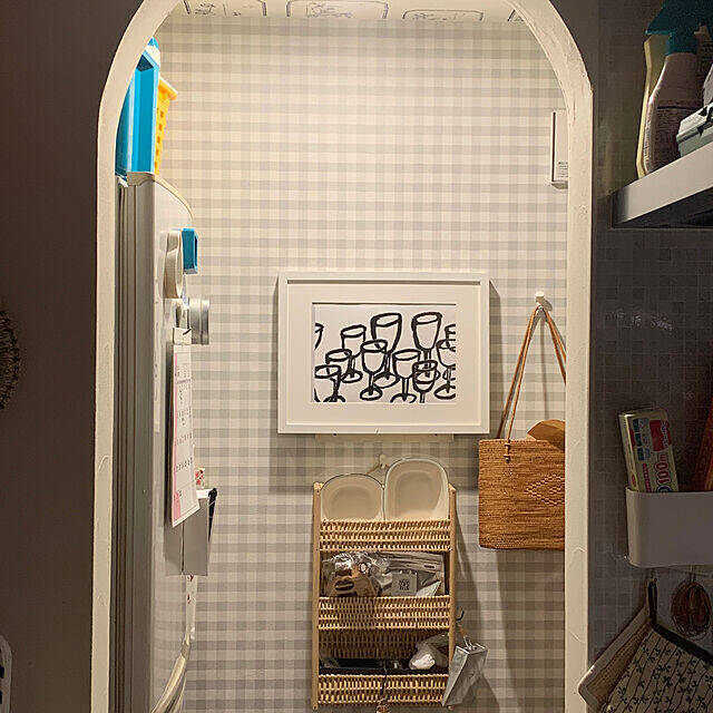 masakoさん宅のパントリーは左側に冷蔵庫があり、キッチンに続く設計になっています。籐のラックやかごバッグのナチュラルな雰囲気が◎。アーチ状の入り口やチェック柄の壁、アートがディスプレイされていているところもポイントです。