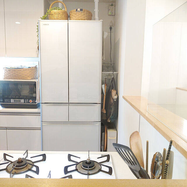 yumikofさんは、冷蔵庫と壁の20cmの隙間に突っ張り棒とS字フックを使ってエコバッグを収納しています。冷蔵庫のすぐ隣なのでさっと取り出せますし、人目にもつきにくく上手に収納されていますね。デッドスペースになりやすい場所を上手に活用したアイデアです。